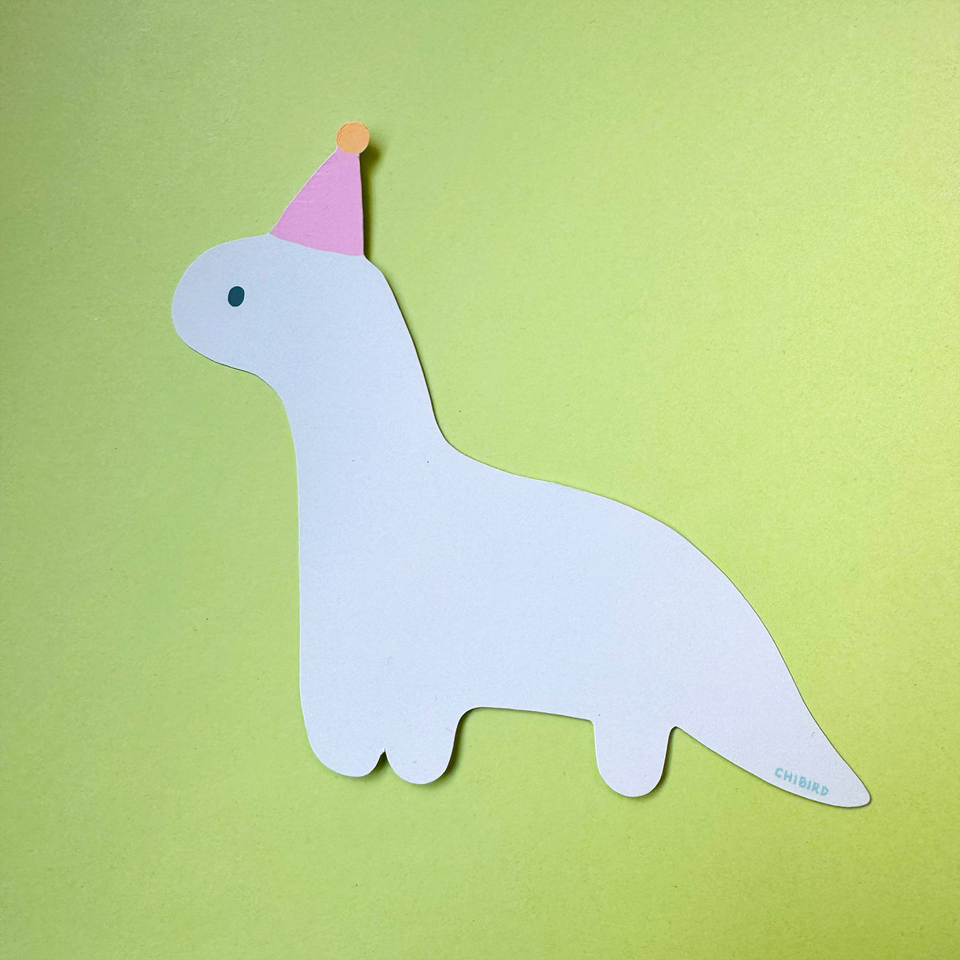 A die-cut party dino card! Printed on a smooth matte paper with lines on the back that you can write your message on. 6" wide and 5" tall. The card can also double as a decorative print to be taped on a wall, or a bookmark.